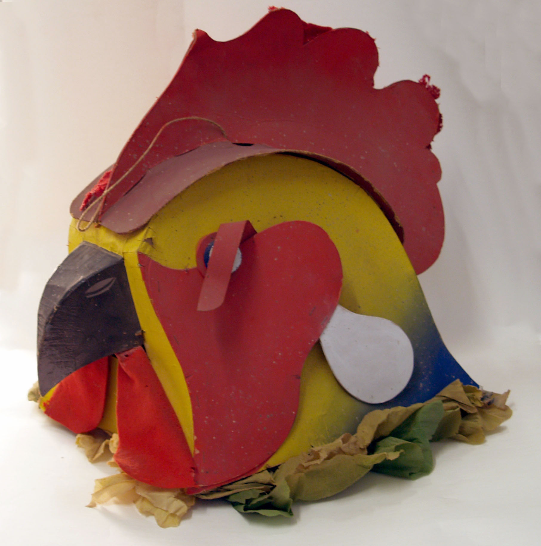 description: Cardboard constructed masks depicting Cockrell and Hen. These masks designed - made by Osborne, won first prize for best couple at the 1952 Auckland Arts Ball